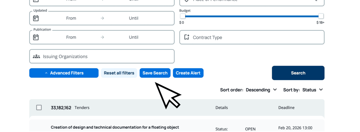 Make a search and save it as an alert. Get notified of new tenders matching your criteria and stay ahead of the competition.
