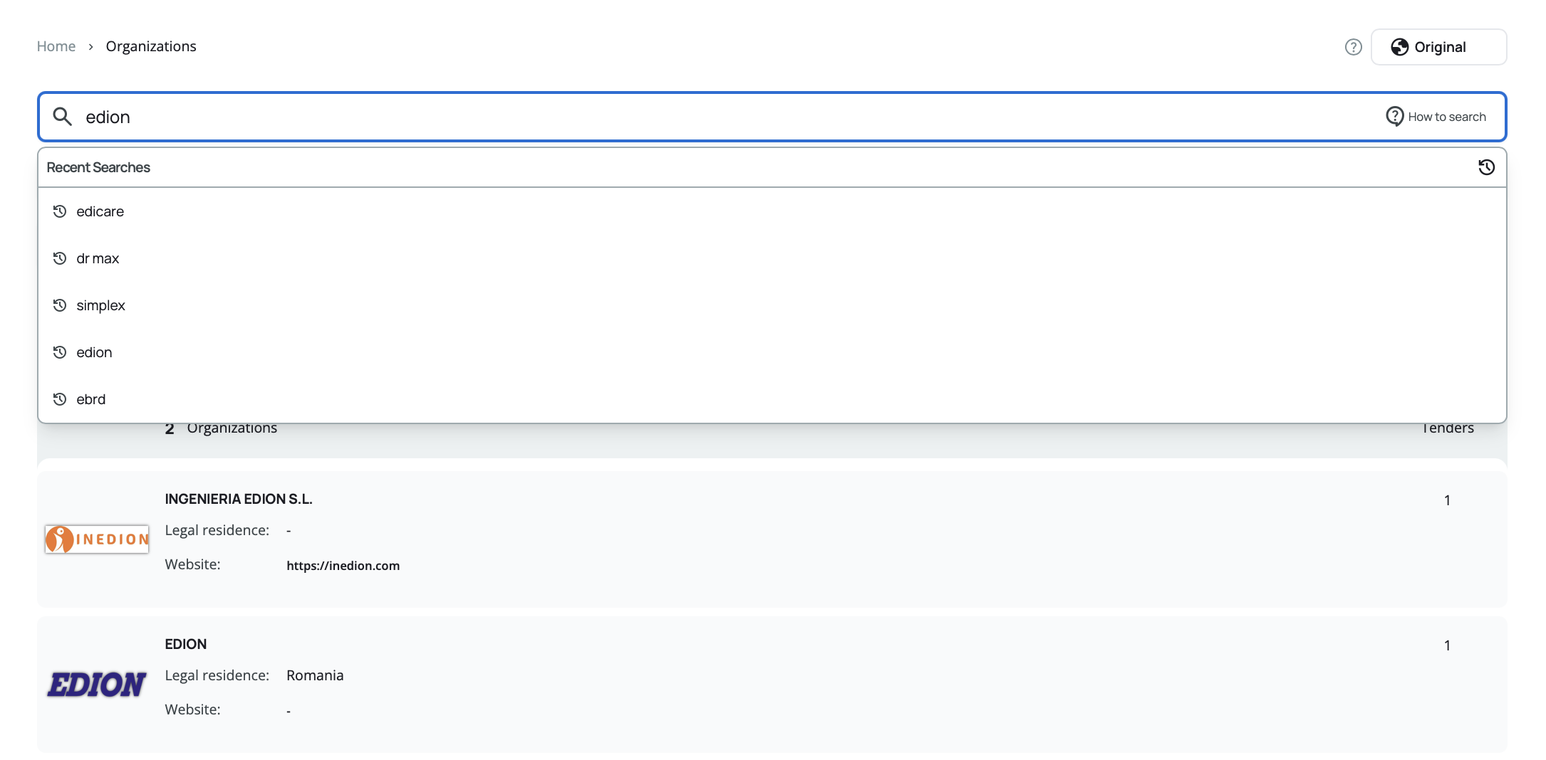 Related Tenders – The number of tenders associated with this organization (where they appear as buyer, supplier, or contracting authority).