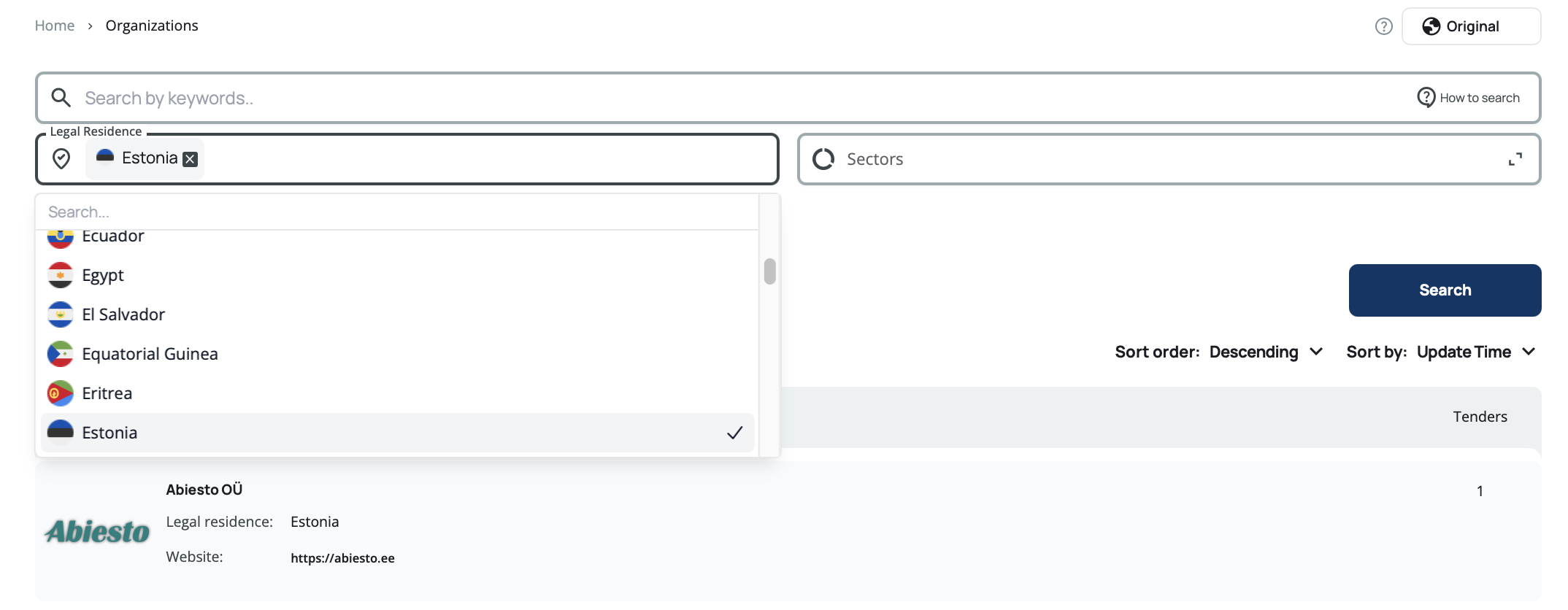 When you first open the organization search page, you'll see all available organizations sorted by update time. You can start searching immediately using the free text search or apply filters to refine your results.