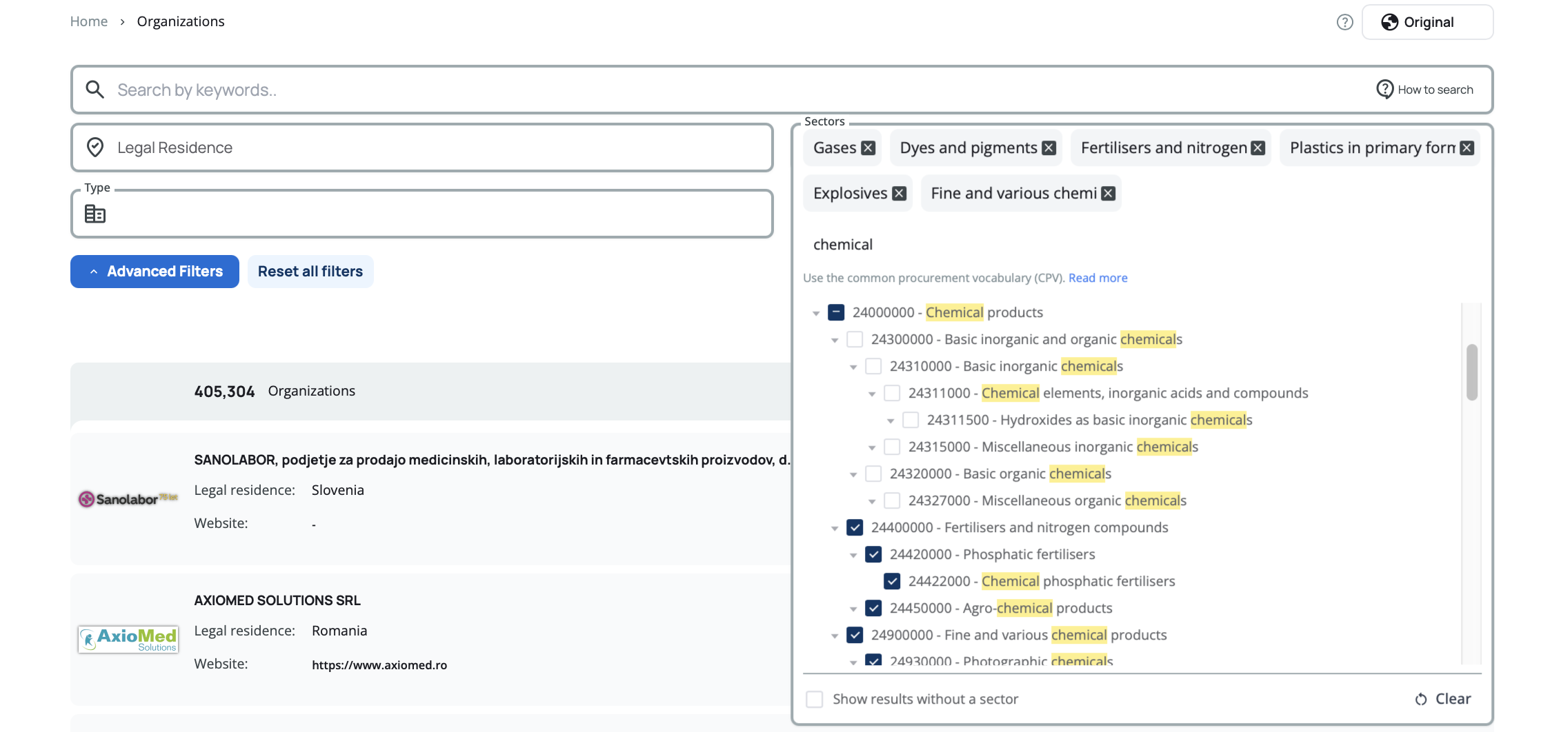 Filter organizations by industry sector using CPV (Common Procurement Vocabulary) codes. This works the same way as the sector filter in tender search. Start typing and suggestions will appear after you've entered 3 letters.