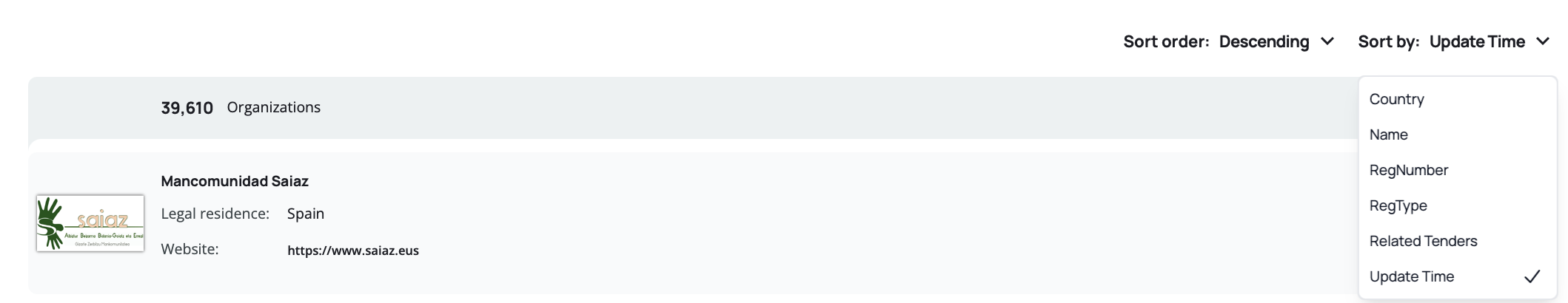 By Related Tenders – Sorts by the number of associated tenders. Descending shows organizations with the most tenders first. Ascending shows organizations with the fewest tenders first.