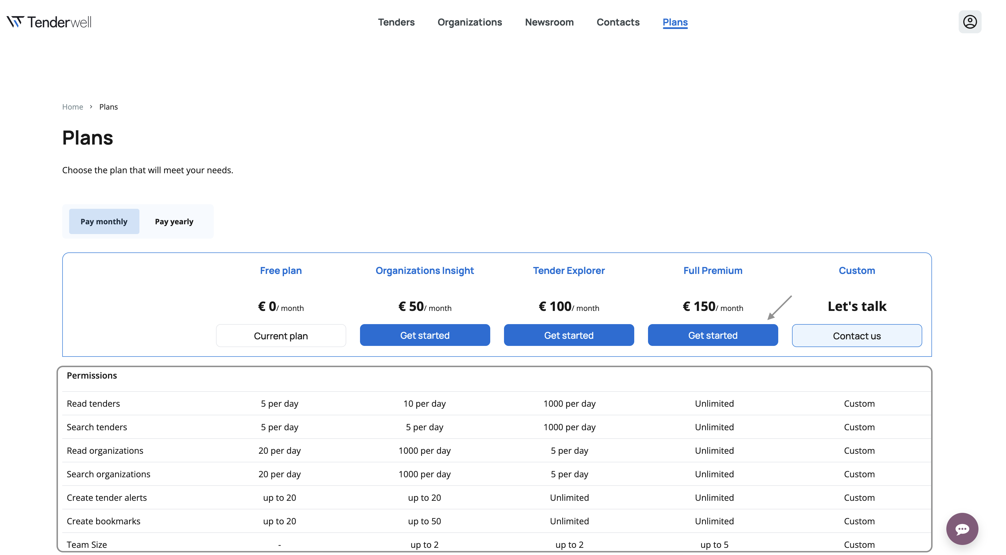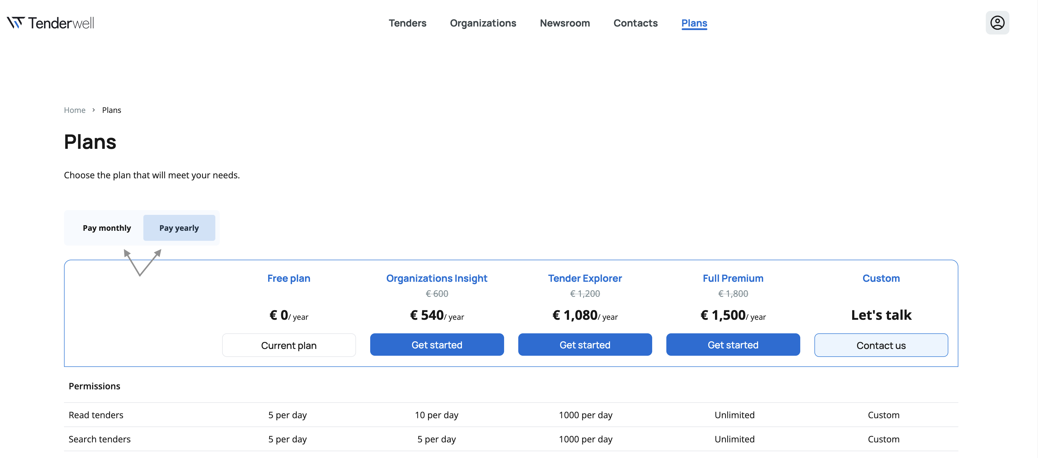 You can use Tenderwell for free to get some limited information about tenders and organizations. If you want to get access to additional data with increased access limits then there are multiple subscription Plans to choose from.