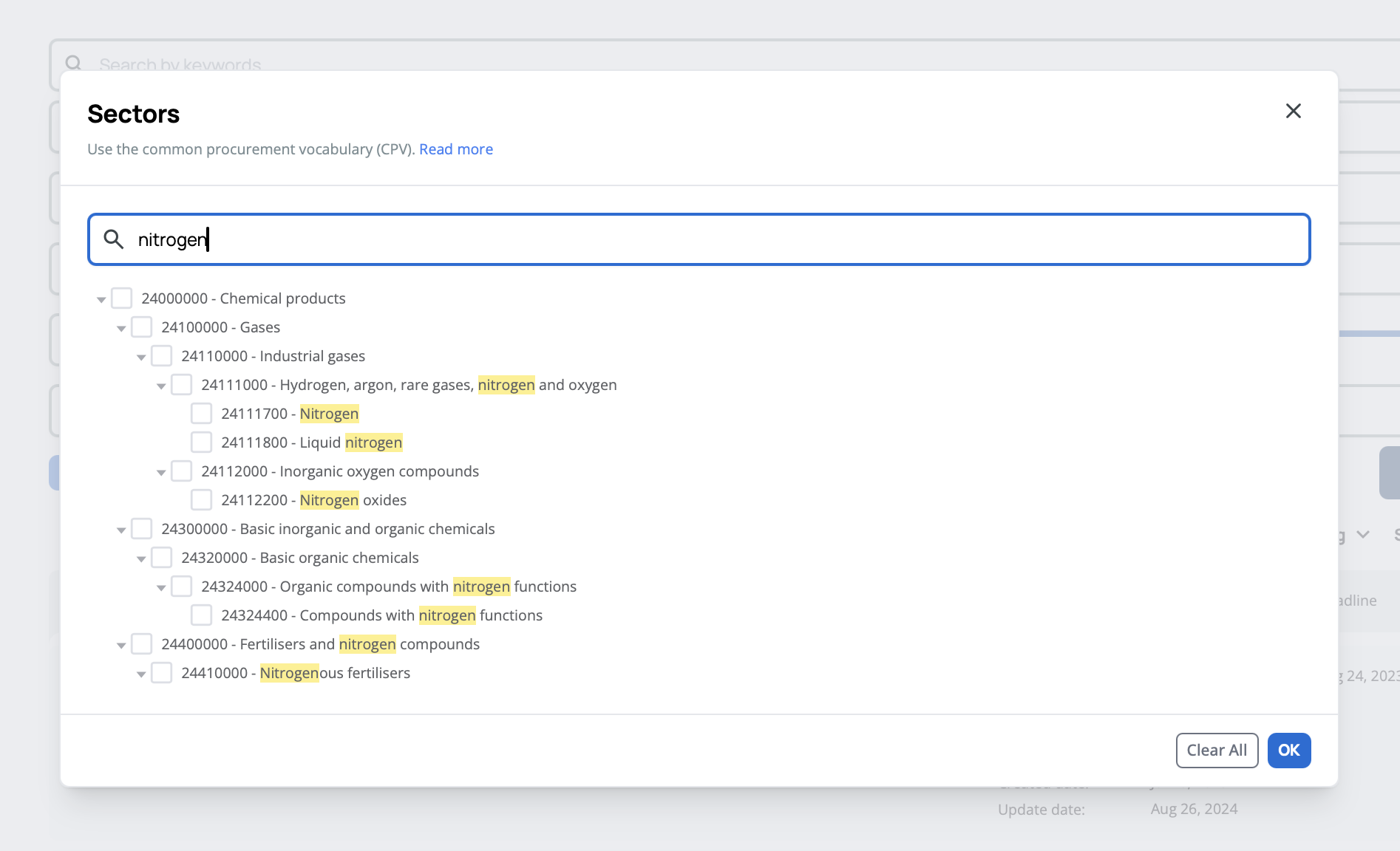 Filter tenders by industry sector using CPV (Common Procurement Vocabulary) codes. Start typing in the search box and suggestions will appear after you've entered 3 letters. You can browse the full sector tree or search for specific sectors.