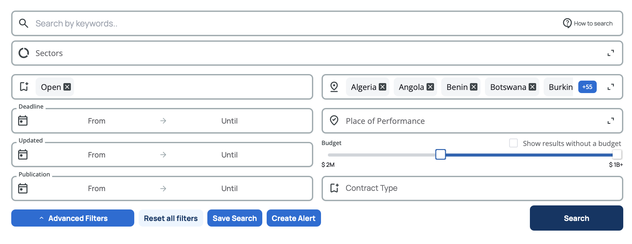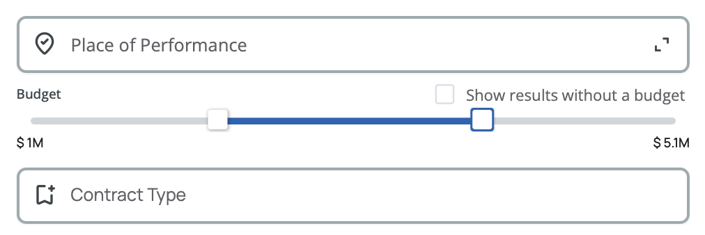 Filter by tender value using the budget range sliders. All amounts are converted to USD equivalent for consistent comparison. Drag the sliders to set your minimum and maximum budget range from $0 to $1 billion+.