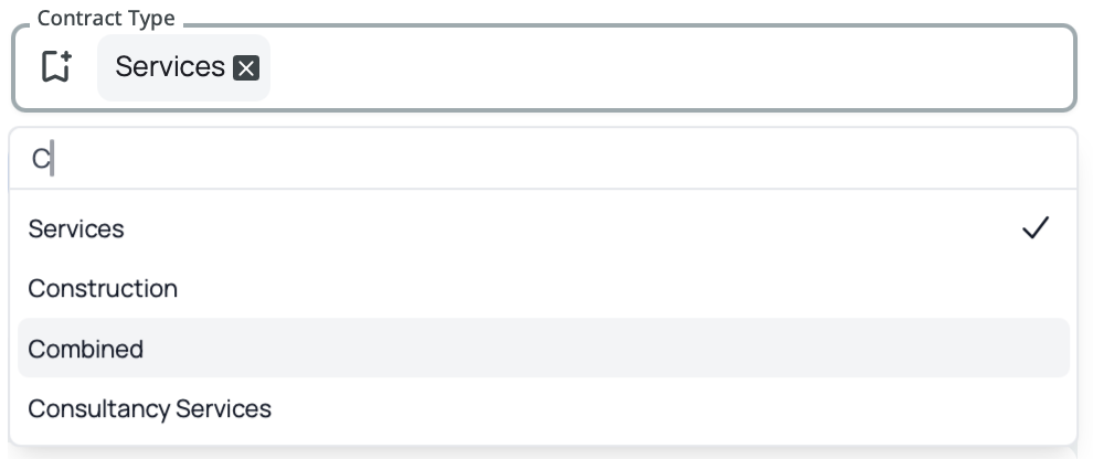 Filter by the type of contract: Works, Goods, Services, Construction, Consultancy, Combined, Others, or Unknown. This helps you find opportunities that match your business capabilities and expertise. Start typing to search (suggestions appear after 1 letter) and your selected type will appear as a removable tag.