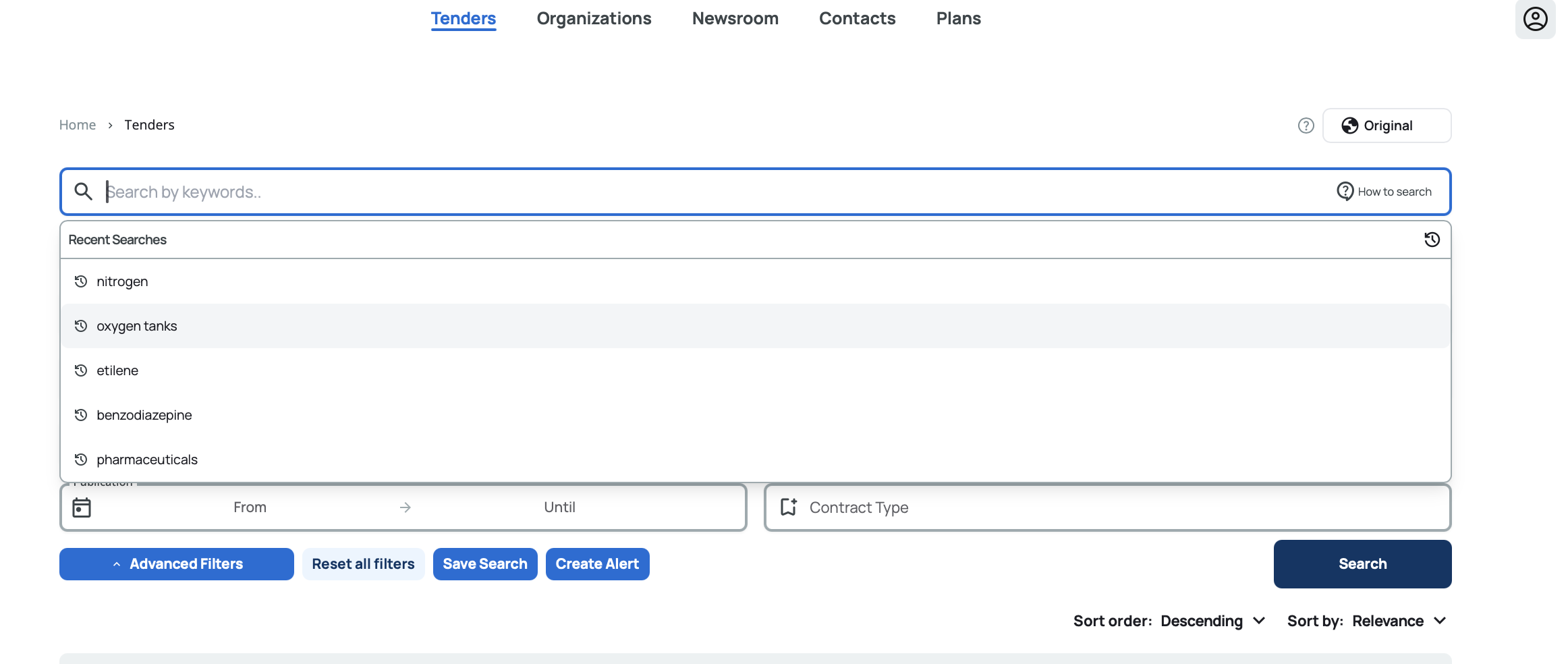 When you first open the tender search page, you'll see all available tenders sorted by status and creation date. You can start searching immediately using the free text search or apply filters to refine your results.