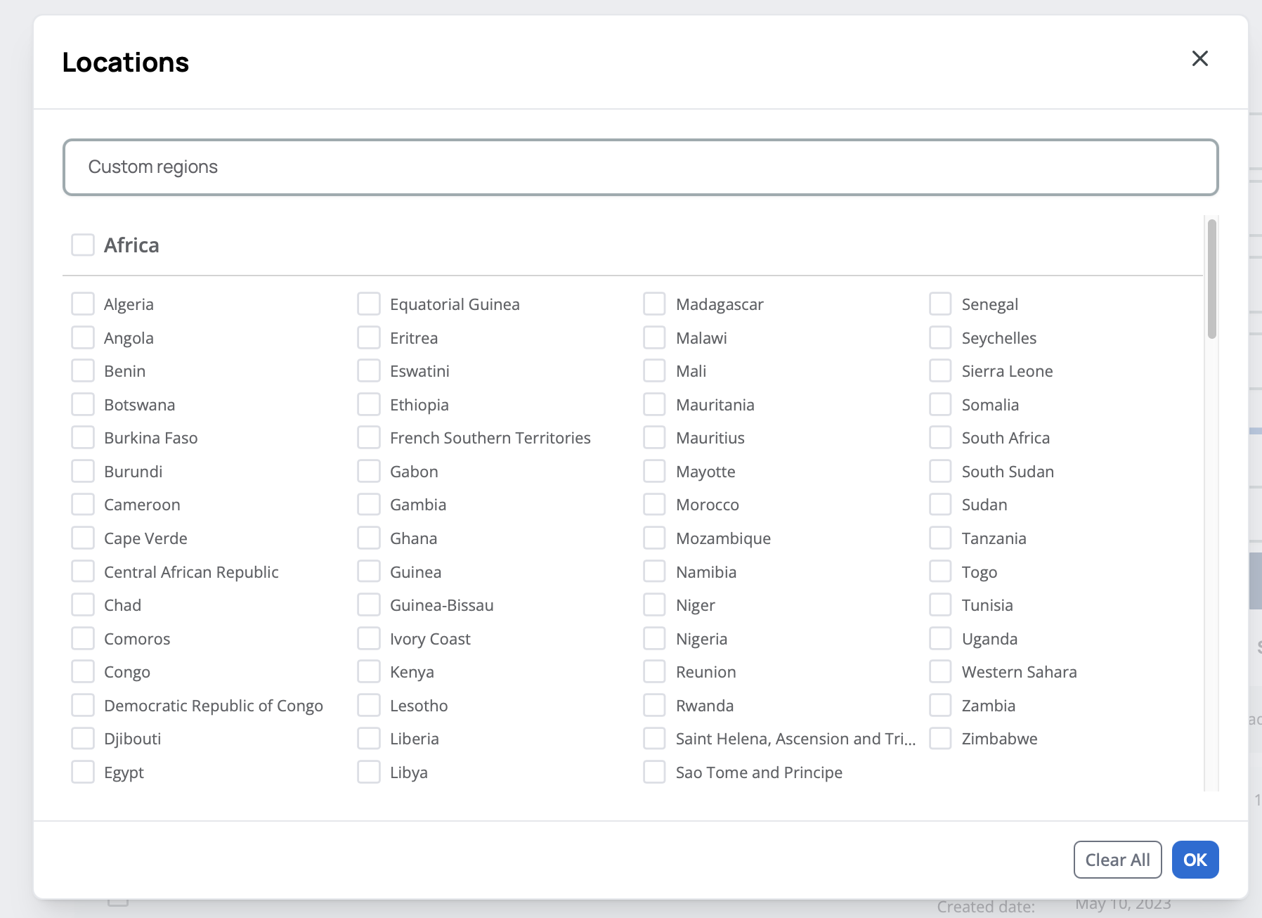 button to view countries in a pop-up window with more space. In the expanded view, you can also select custom regions like MENA, South Asia, and others by typing in the 'Custom regions' search field or selecting from the list.