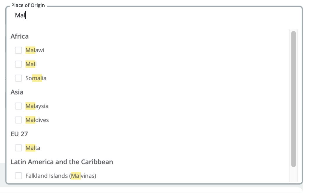 Filter by the country or region where the tender is issued. Start typing to search (suggestions appear after 3 letters) or scroll through the list of countries grouped by region.