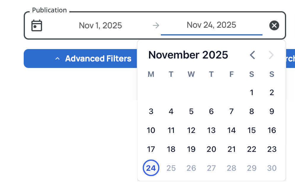 Filter by when the tender was originally published on the source platform, not on Tenderwell. This is useful if you want to track new opportunities as they appear or review tenders published within a specific time frame. Works exactly like the Deadline date picker.