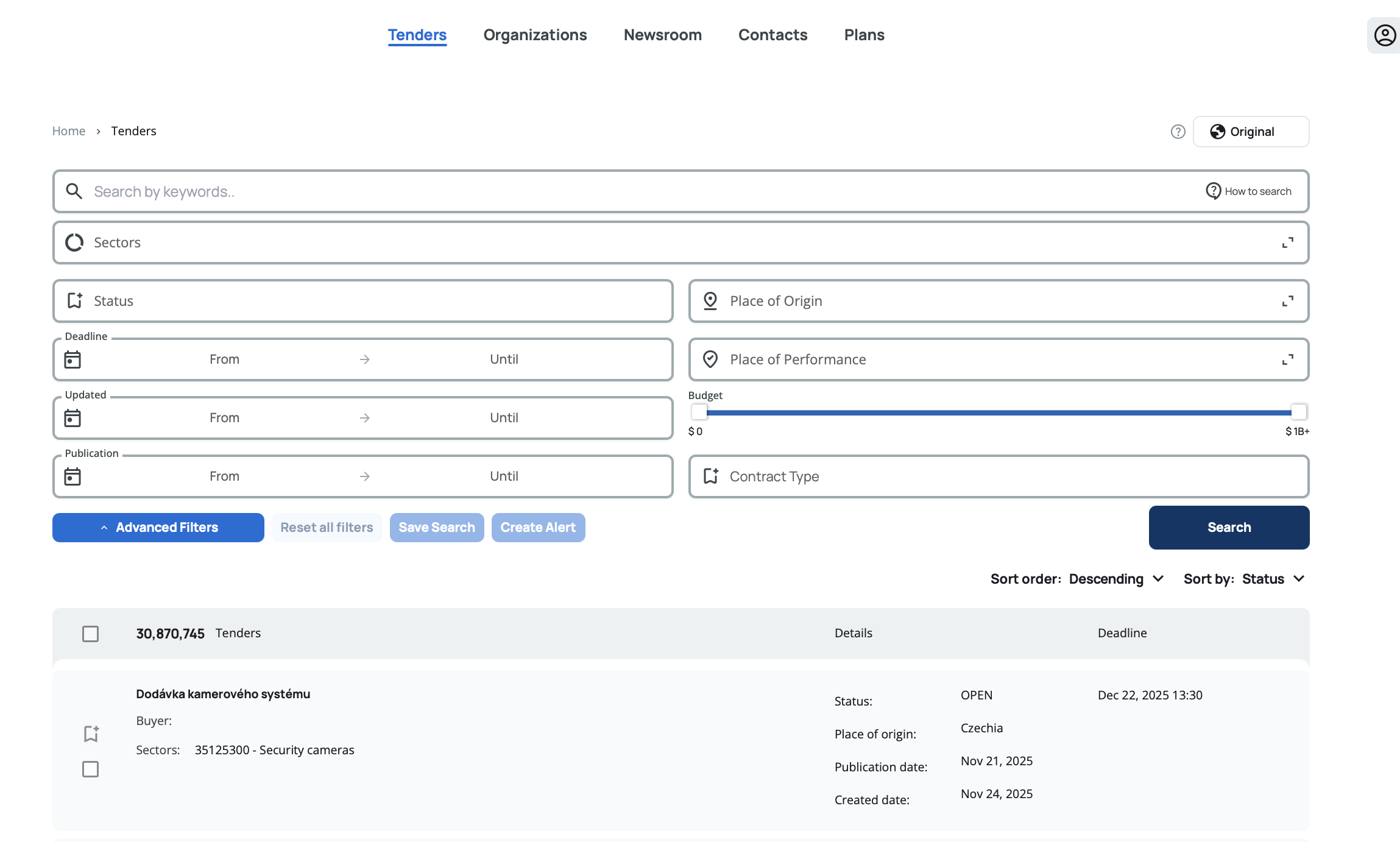 By Budget – Sorts by tender value (converted to USD). Descending shows the highest budgets first. Ascending shows tenders without budgets first, followed by the lowest amounts.
