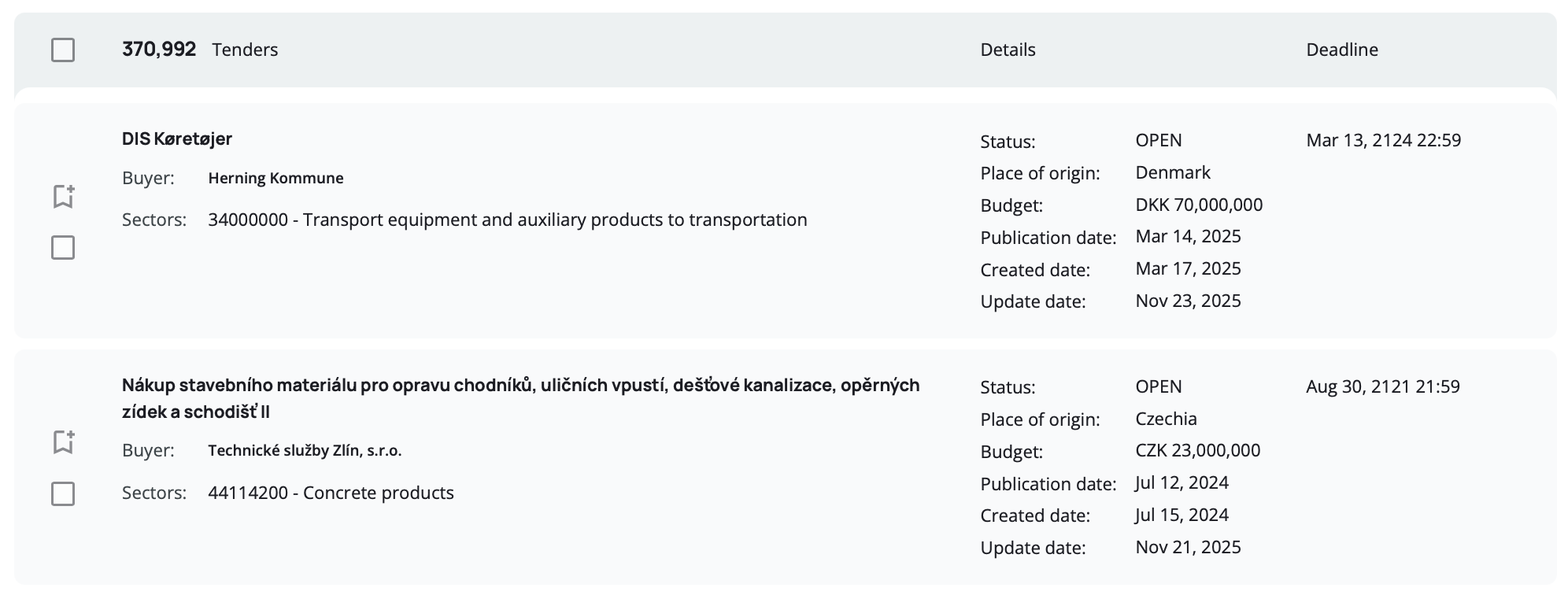By default, all tenders are shown including those without deadlines. Some tenders may not have a deadline specified in the deadline field, but the deadline information might be available in the attached tender documentation. If you prefer to focus only on tenders with clearly stated deadlines, check the