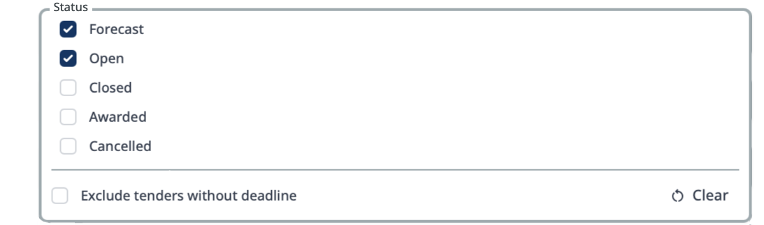 Filter by the tender's current phase using checkboxes: Open, Closed, Awarded, Cancelled, or Forecast. You can select multiple statuses at once.