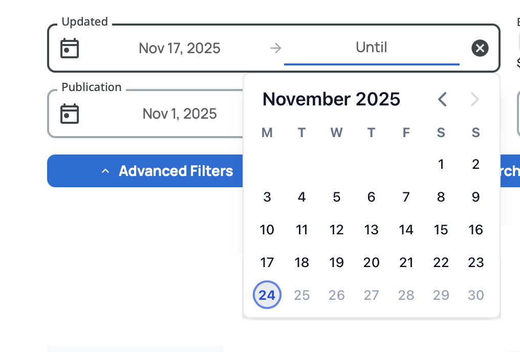 Filter by when the tender information was last updated in our system. This helps you monitor tenders that have been modified, such as deadline extensions, budget changes, or updated requirements. Works exactly like the Deadline date picker.